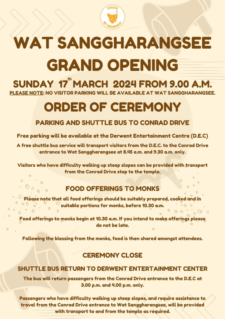 The temple will provide a shuttle bus from the parking area to the temple at 8:30 and 9:30 am.
