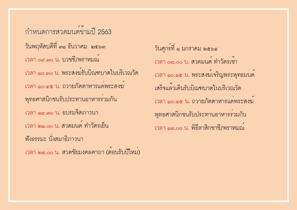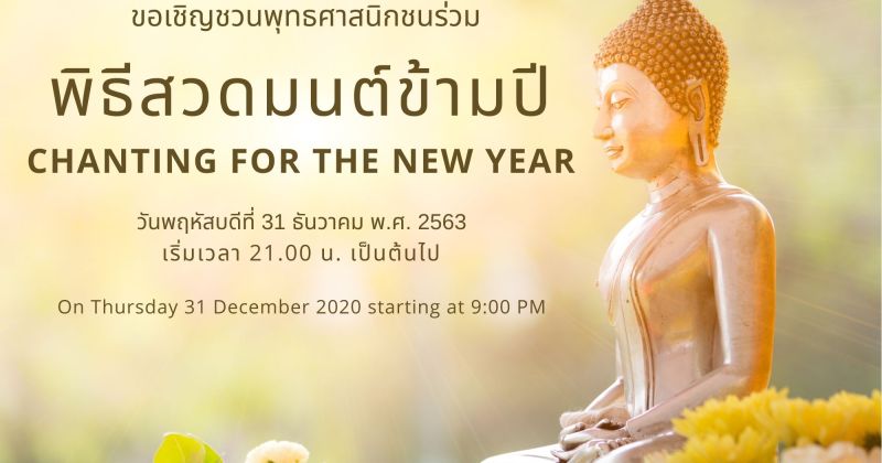 ขอเชิญชวนพุทธศาสนิกชนร่วมพิธีสวดมนต์ข้ามปี ในวันพฤหัสบดีที่ 31 ธันวาคม พ.ศ. 2563 เริ่มเวลา 21.00 น. เป็นต้นไป
